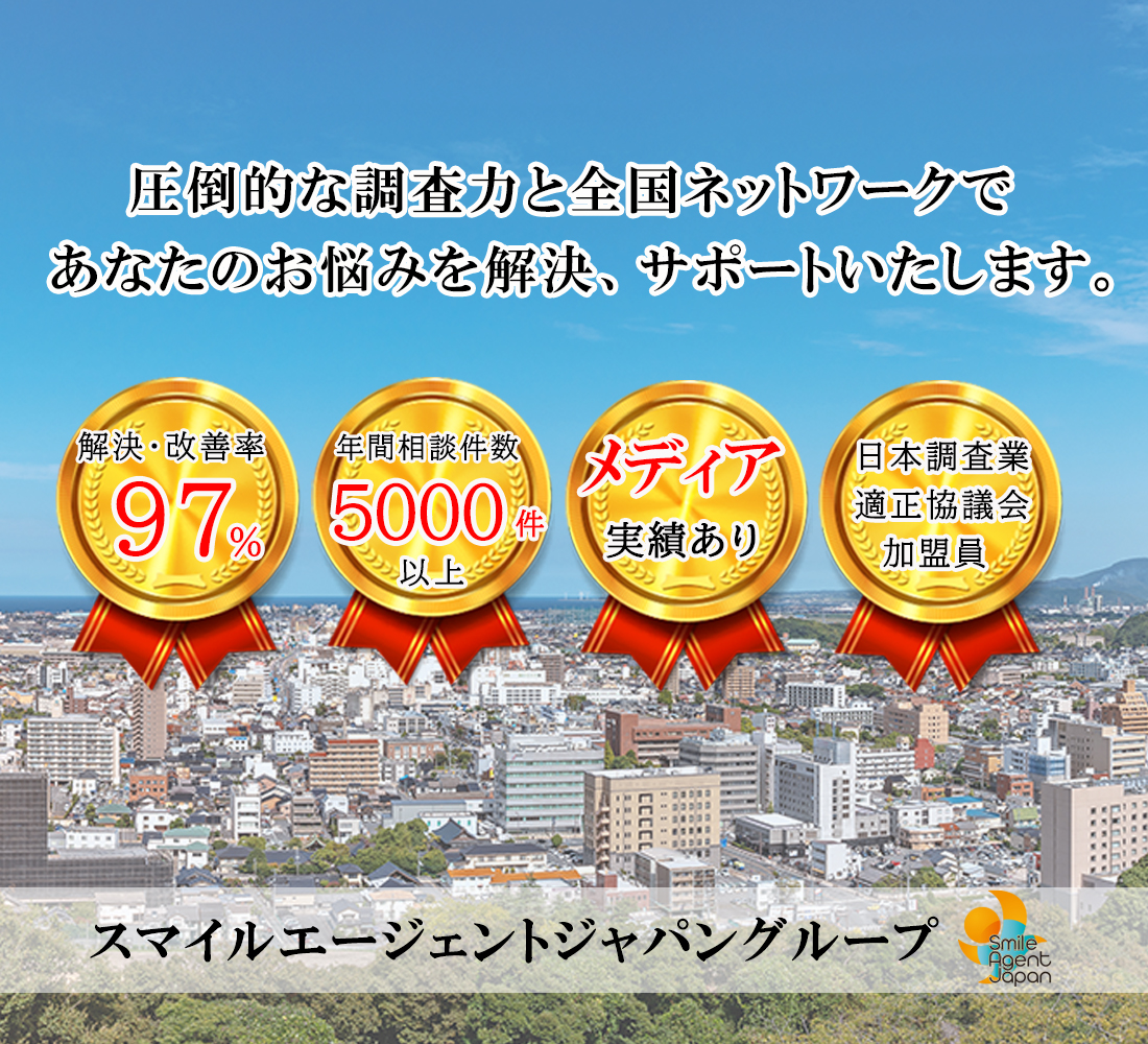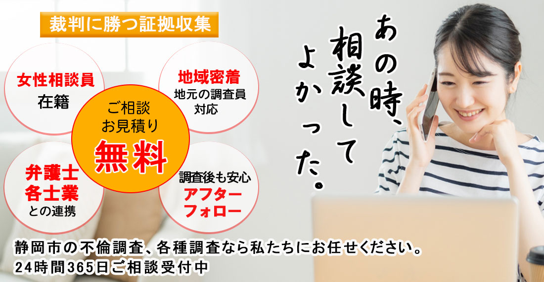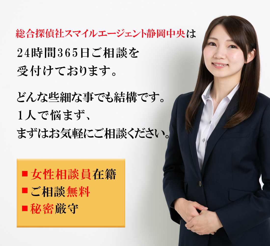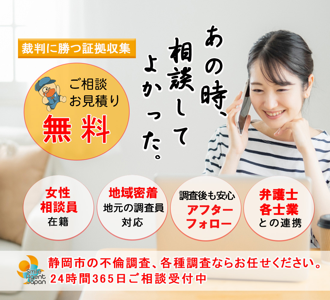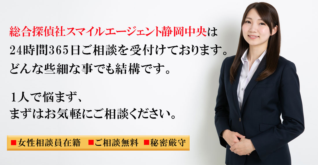 静岡市で不倫・浮気調査や行方調査、ペット捜索などの各種調査で探偵をお探しの際にはご相談・お見積りは無料となっておりますので一度、総合探偵社スマイルエージェント静岡中央までお気軽にご相談ください。